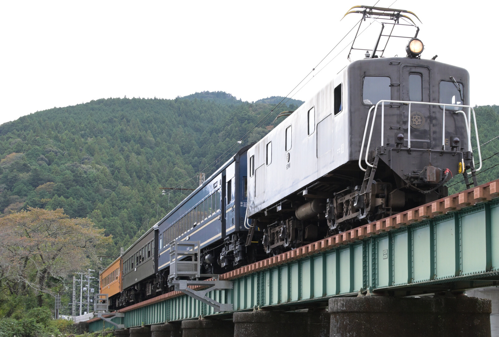 E101が客車3両と牽いてます。